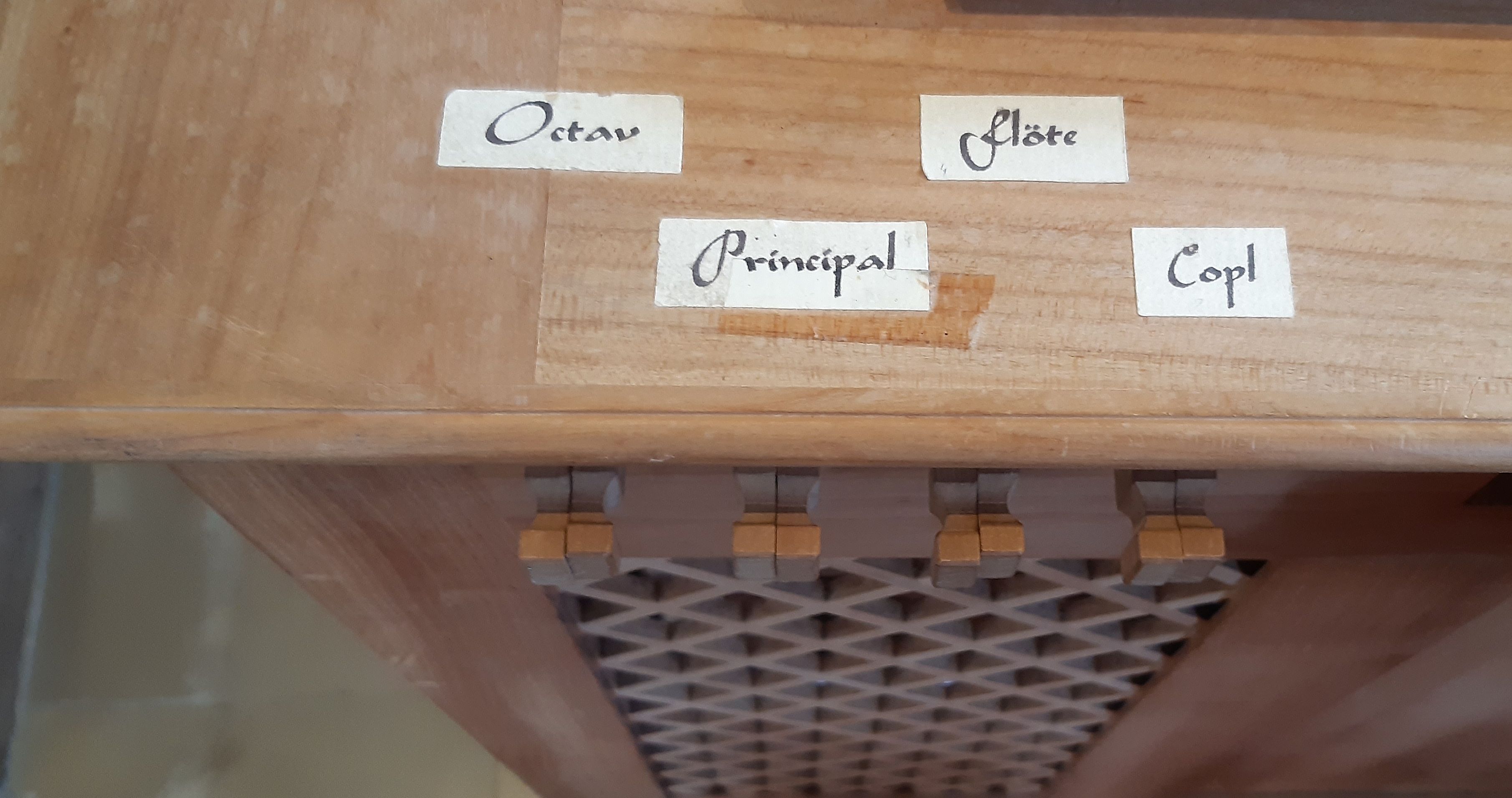 Die Register sind zweigeteilt: Der linke Teil wirkt auf die unteren Oktaven bis zum c1, der rechte Teil wirkt ab c1.